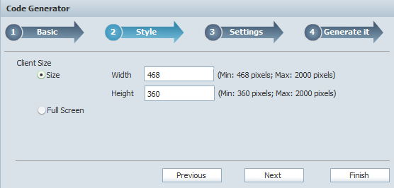 To generate code for your chat: 1.Select the code type you need to generate in Code Type drop-down list, considering its better compatibility performance, we recommend JavaScript. 2.You can choose the client type that you need to generate code here, they are may be Standard chat, Admin panel, Lite chat, Avatar chat, Html chat, Pocket PC chat or Banner chat. 3. Enter the size of client end, you may set it to specific size or full screen. If you set the minimize size, we recommend you to hide userlist for a more space of chat. And you can set to hide the uerlist: Admin Panel->Client Settings->Layout-> Default Display User List, check No and save.